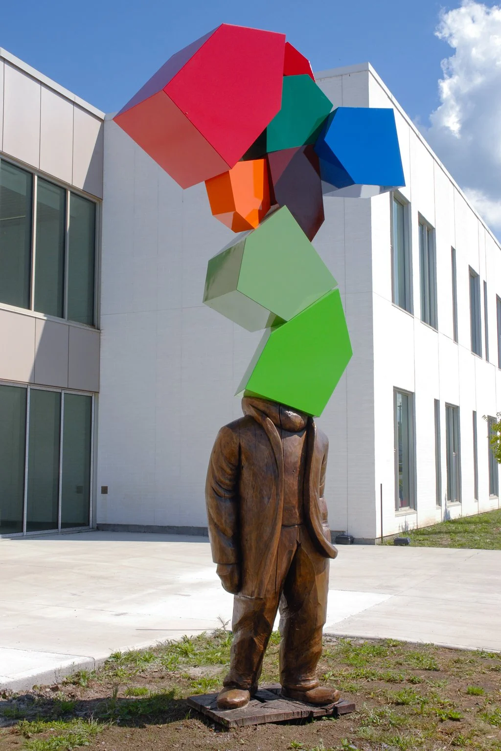 Le personnage-maison est un architecte ou un clown sorti directement de l’univers de l’enfance. La sculpture du personnage a été faite en bois puis moulée avec les traces bien visibles du savoir-faire (gouges, scie à chaîne) de Saint-Jean-Port-Joli. La tige de la fleur a été moulée à partir d’un véritable cèdre du bord du fleuve. C’est une mise en abîme pour ce joli village qui se nomme Les Cèdres !