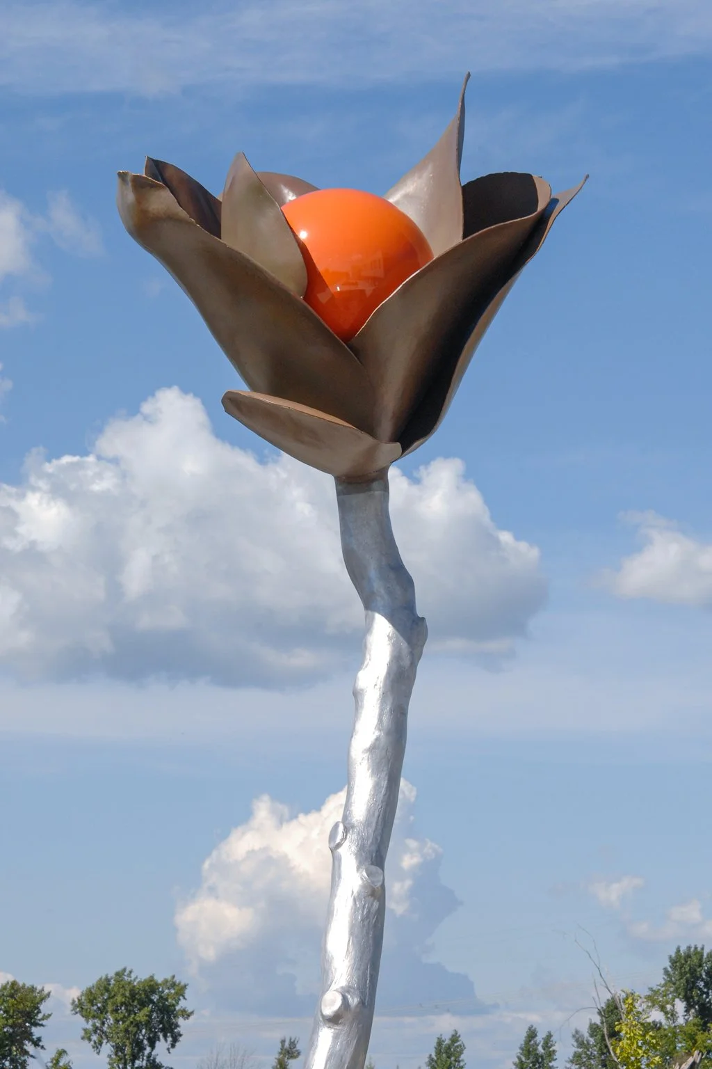 Pivoine : 330 cm de haut. Tige pleine coulée en aluminium à partir du moulage d’un véritable cèdre croche, de 4 à 5 pouces de diamètre X 8.5 pieds de haut. Pétales chaudronnés en aluminium. Aluminium 5052 H 32, 1/8 d’épais et 6061-T 6 de 1/2