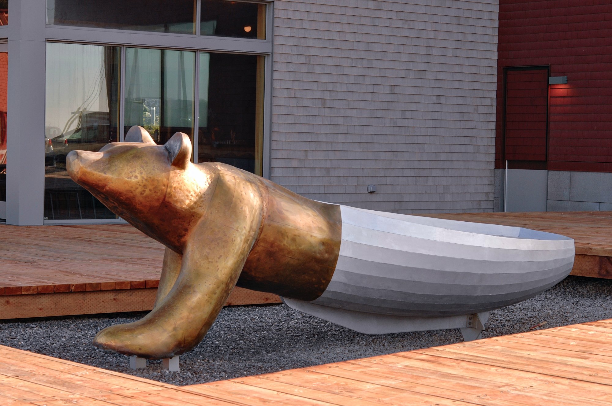 L’aluminium est de type 5052-T6, épaisseur 1/4". Les membrures verticales supportent les bordés (planches horizontales). La barque est assemblée à l’ours de façon mécanique, celle-ci est fait de laiton de 1/8 d’épais Le laiton a reçu une patine à chaud, une chimie qui protège le matériau. L’ours a d’abord été sculpté en bois et le laiton a été chaudronné sur cette matrice qui a été ensuite retirée.